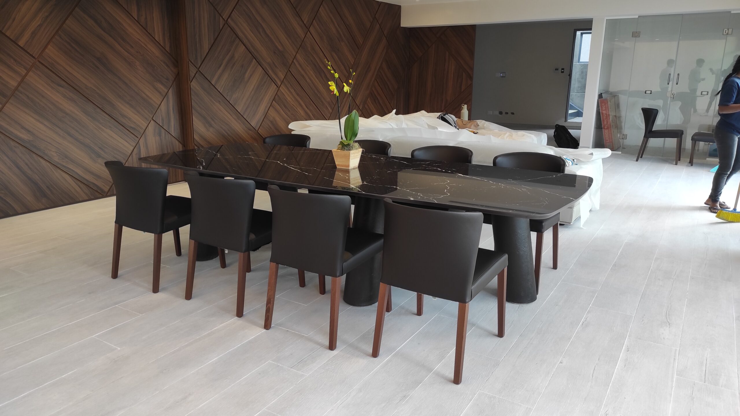 El tope de la mesa está hecho de piedra sinterizada de alta calidad, lo que le da una apariencia única y elegante. La superficie es resistente a las manchas y al calor, lo que la hace perfecta para comidas y cenas con amigos y familiares. Además, la piedra es fácil de limpiar y mantener, lo que garantiza que la mesa se verá como nueva durante años.