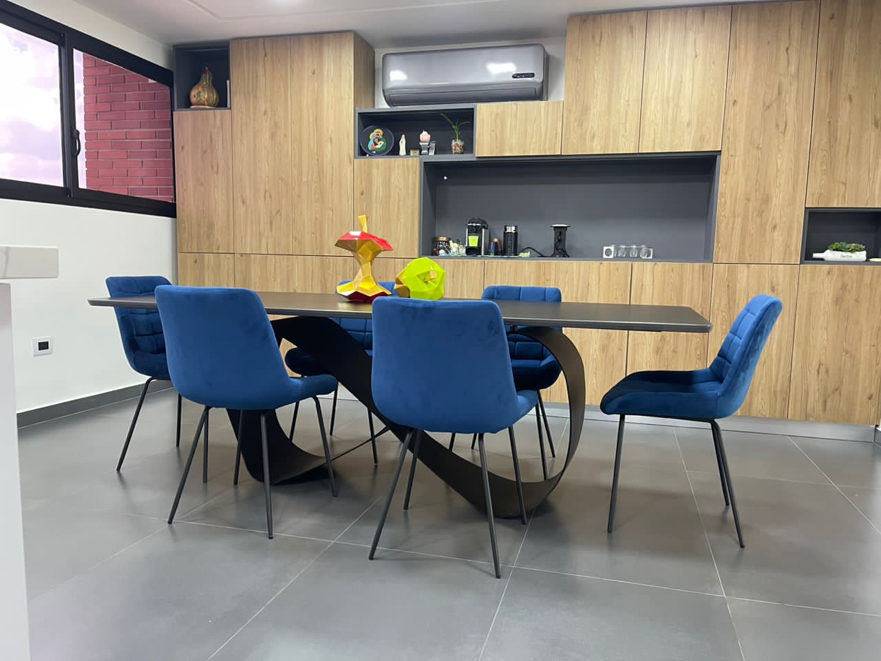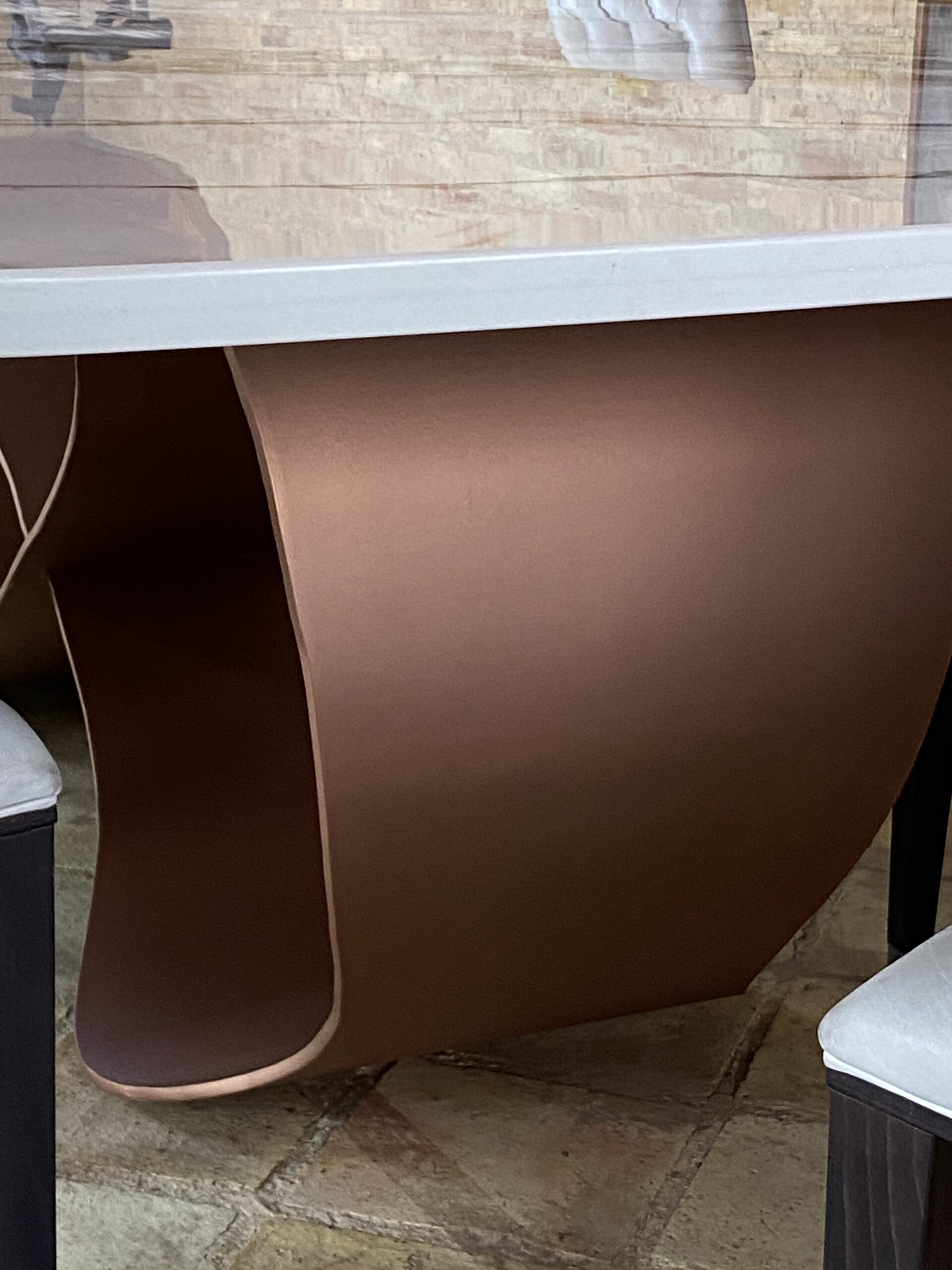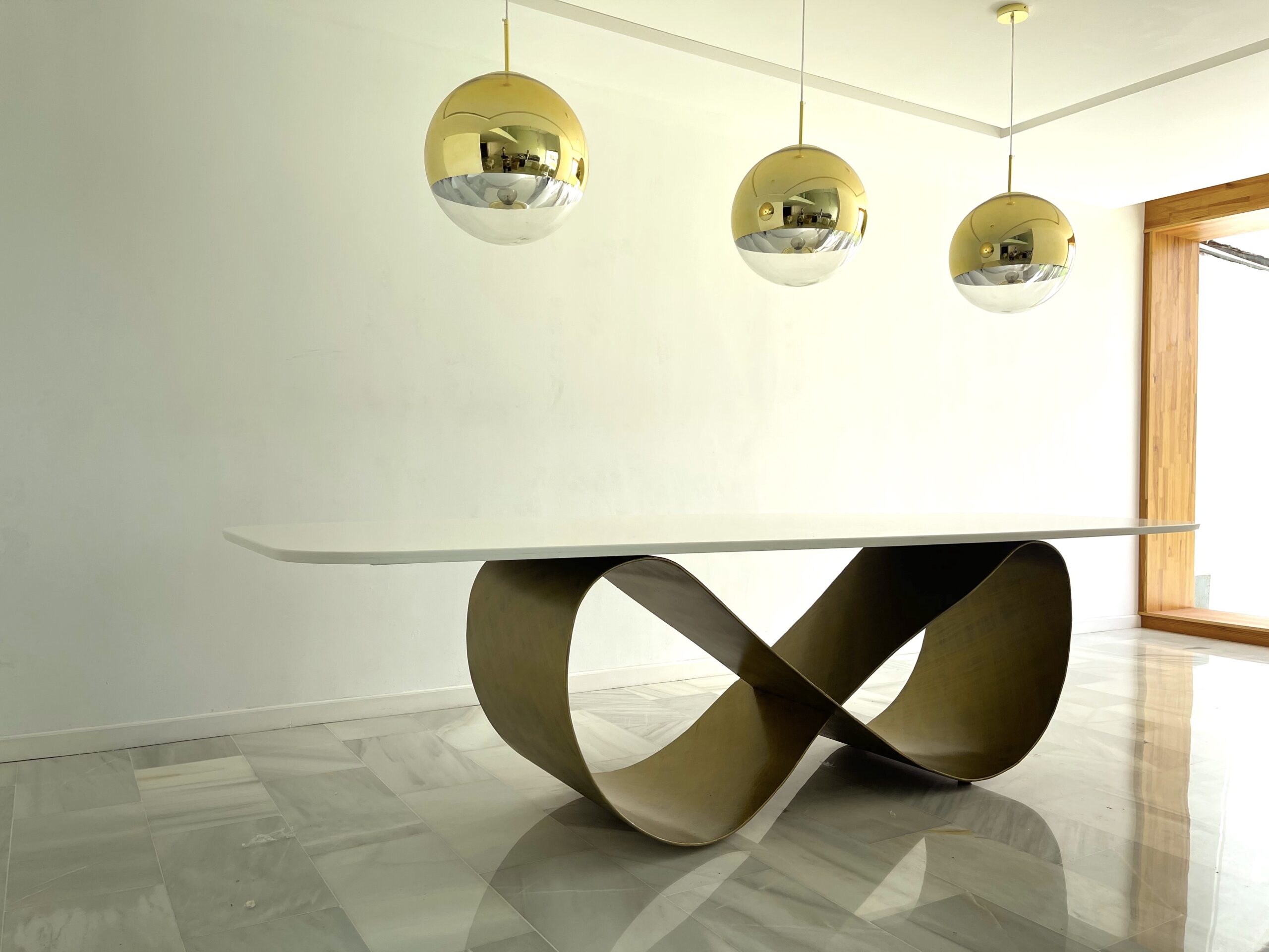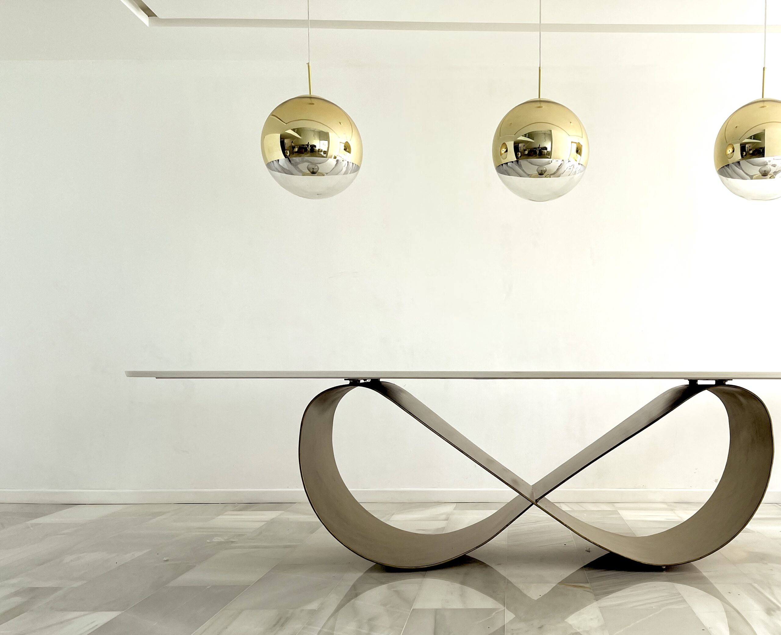 Esta mesa, bautizada como Papillon, es una sublime fusión entre la funcionalidad del mobiliario y la expresividad del arte. Su base de hierro forjado en frío, con una forma de infinito, es una clara muestra de la delicadeza y la precisión de la técnica. El tope, elaborado con piedra sinterizada italiana, es el resultado de un proceso de fabricación propio que garantiza su calidad y durabilidad.